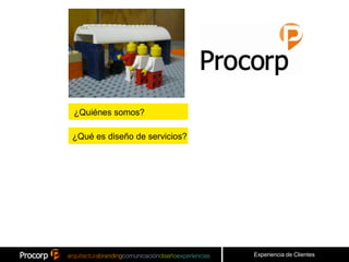 Procorp, con más de 25 años de experiencia, ofrece servicios estratégicos y creativos para mejorar la competitividad de las empresas a través del diseño de servicios centrados en la experiencia del cliente. El diseño de servicios se define como el uso de design thinking para innovar en servicios, creando experiencias memorables que influyen en el comportamiento del consumidor. El enfoque multidisciplinario incluye investigaciones etnográficas y co-creación con stakeholders para identificar y mejorar los puntos de contacto del cliente.