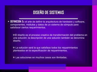 Este documento describe el diseño de sistemas como el proceso de definir la arquitectura de hardware y software para satisfacer los requerimientos de un sistema. Explica que el diseño transforma un problema en una solución mediante la especificación de requerimientos, objetivos, características y etapas como el diseño de datos, arquitectónico, interfaz y procedimientos. También cubre decisiones que debe tomar un diseñador como organizar subsistemas, asignar tareas, seleccionar implementaciones y manejar condiciones.