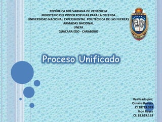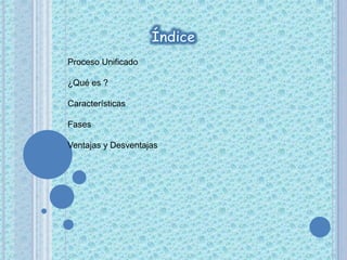 Este documento resume el proceso unificado, un enfoque para el desarrollo de software que se centra en la arquitectura y los casos de uso. Explica que el proceso unificado tiene cuatro fases: inicio, elaboración, construcción y transición. También destaca algunas de sus características clave como que se enfoca en los riesgos y está dirigido por los casos de uso, y menciona brevemente algunas ventajas y desventajas.
