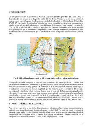 Este documento describe el diseño de terraplenes sobre suelos turbosos para un proyecto vial en Santa Cruz. Se analizaron varias alternativas y se eligió fundar los terraplenes sobre geotextiles tejidos que repartan las tensiones y eviten la mezcla con la turba subyacente. Debido a los asentamientos inevitables, se propone construir los terraplenes por etapas aprovechando que la turba gana resistencia con el tiempo. El documento analiza la estabilidad de los terraplenes en distintas etapas