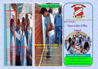 El documento describe un proyecto escolar en el que estudiantes del tercer grado midieron su peso, talla y calcularon su índice de masa corporal. Los estudiantes completaron una encuesta sobre su alimentación diaria y aprendieron sobre la importancia de comer de manera balanceada. El proyecto tuvo como objetivo crear conciencia sobre la necesidad de mejorar los hábitos alimenticios para mantener una buena salud.