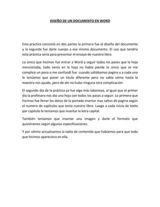 Esta práctica consistió en dos partes: 1) el diseño de un documento en Word siguiendo los pasos provistos, incluyendo la adición de títulos a páginas y saltos de página; y 2) agregar contenido al documento como una portada, capítulos con letras iniciales mayúsculas, una imagen formateada, y actualizar la tabla de contenido. El propósito de la práctica era presentar un ensayo de libro.