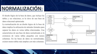 El documento aborda la importancia del diseño lógico y la normalización de bases de datos relacionales para optimizar su rendimiento, resaltando la creación de tablas con relaciones adecuadas. Se discuten reglas de normalización y la integridad de los datos, así como la necesidad de un diseño bien definido para adaptarse a las necesidades del usuario y mejorar la eficiencia. Finalmente, se enfatiza la importancia del mantenimiento y la planificación adecuada para garantizar un buen funcionamiento y acceso a información actualizada.