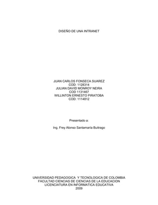 Este documento presenta el diseño de una intranet para el colegio Nicolás Cuervo y Rojas. Tres estudiantes de la Licenciatura en Informática Educativa de la Universidad Pedagógica y Tecnológica de Colombia presentan este proyecto ante su profesor Frey Alonso Santamaría Buitrago. El objetivo es mejorar la comunicación interna en el colegio mediante el uso de una intranet. El documento explica los antecedentes, definición del problema, justificación, objetivos y alcances del proyecto. También describe los pas