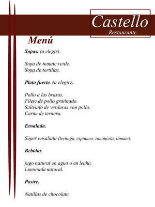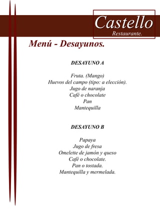 El documento presenta el menú de un restaurante llamado Castello, incluyendo opciones para el desayuno, sopas, platos fuertes, ensaladas y postres. El desayuno A incluye fruta, huevos, jugo y café, mientras que el desayuno B contiene papaya, omelette de jamón y queso, y café. Las sopas disponibles son de tomate verde y tortilla. Los platos fuertes son pollo a las brasas, filete de pollo gratinado y salteado de verduras con pollo o carne de t