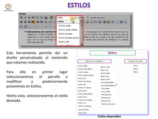 El documento describe diversas herramientas para personalizar y gestionar contenido, incluyendo la modificación de estilos, la creación de enlaces y anclas, y la inserción de imágenes y archivos multimedia. Proporciona instrucciones específicas sobre cómo realizar estas acciones en una interfaz de contenido. Cada sección detalla un proceso paso a paso para mejorar la interacción con el contenido creado.