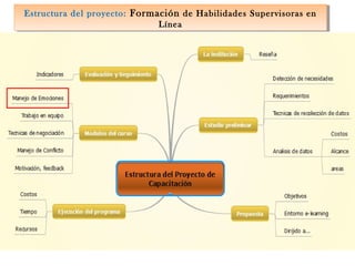 Este documento presenta el diseño curricular de un módulo sobre manejo de emociones para un curso de habilidades supervisoras en línea. El módulo contiene 4 capítulos e incluye objetivos, contenidos, actividades, recursos y estrategias de evaluación. El diseño instruccional detalla la estructura del curso de 100% en línea con 5 módulos de 4 semanas cada uno con el objetivo de desarrollar habilidades interpersonales.