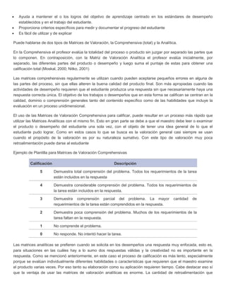 El documento describe los conceptos clave de una matriz de valoración o rúbrica y su importancia en la evaluación del desempeño estudiantil. Una matriz de valoración facilita la calificación de áreas complejas mediante criterios específicos que permiten valorar los conocimientos y competencias adquiridos. Generalmente se diseña para que la evaluación sea objetiva y consistente, aclarando las expectativas del profesor. Las matrices pueden ser comprehensivas, evaluando el producto en su totalidad, o analíticas, evaluando partes por separado para obtener retroal