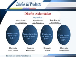 El documento describe el proceso de diseño de productos, incluyendo conceptos de creatividad e innovación, los dominios de diseño (necesidades del cliente, requisitos funcionales, diseño de parámetros, variables de proceso), las fases del diseño (diseño de conceptos, diseño de producto, diseño de proceso), los axiomas y corolarios de diseño, y las etapas para la evaluación del desempeño, diseño para ensamble, diseño para manufactura y otros análisis como la evaluación de costos y la confiabilidad.