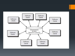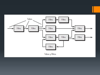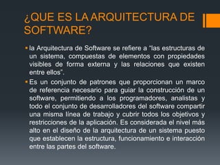 El documento describe los conceptos fundamentales de la arquitectura de software, incluyendo su definición, características, estilos arquitectónicos, representación del sistema en contexto y lenguajes de descripción arquitectónica. La arquitectura de software establece la estructura y la interacción entre las partes de un software. Existen diferentes estilos como la arquitectura centrada en datos y la arquitectura de flujo de datos. Un diagrama de contexto arquitectónico representa cómo el software interactúa con otros sistemas.