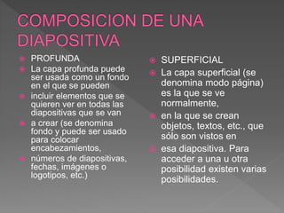 El documento describe las funciones básicas de PowerPoint para crear y formatear diapositivas, incluyendo la inserción de texto, imágenes, formas y la creación de capas profundas y superficiales. También explica cómo agregar nuevas diapositivas, cambiar entre ellas, y guardar la presentación en diferentes formatos.