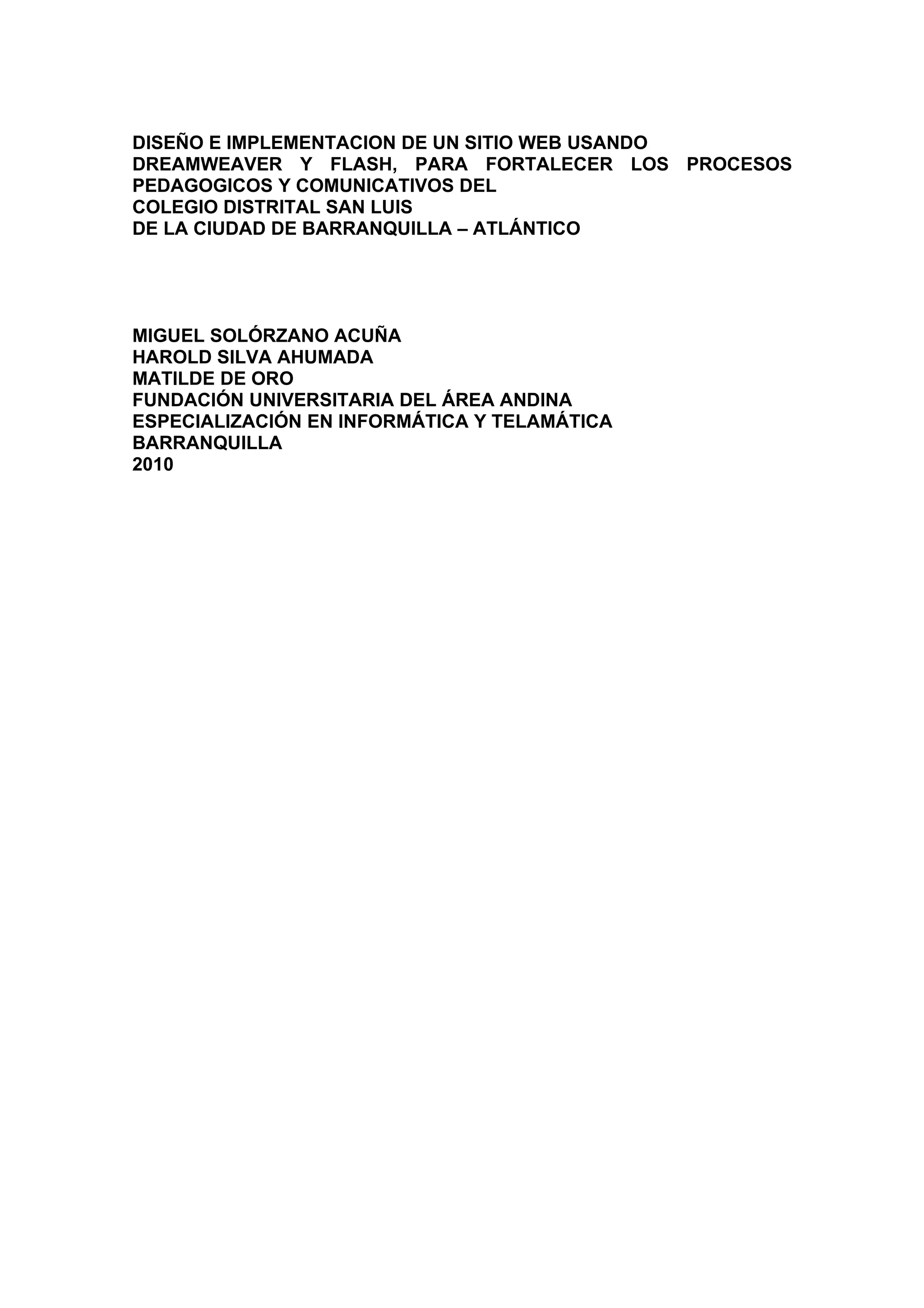 Este documento presenta un proyecto para diseñar e implementar un sitio web para el Colegio Distrital San Luis usando Dreamweaver y Flash. El objetivo es fortalecer los procesos pedagógicos y la comunicación en situaciones de aprendizaje. El documento analiza el problema actual de falta de recursos tecnológicos y capacitación docente. También justifica la necesidad del proyecto para mejorar la calidad educativa de acuerdo con las políticas nacionales de educación y las exigencias de un mundo globalizado.