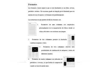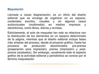 La maquetación es el oficio del diseño editorial que se encarga de organizar contenidos escritos, visuales y en algunos casos audiovisuales en medios impresos y electrónicos como libros, diarios y revistas. Incluye la distribución de elementos en la página y el diseño del proyecto gráfico general. Los periódicos pueden tener formatos estándar, tabloide o de sábana, dependiendo del tamaño y organización de las páginas. Un elemento clave de la maquetación es la retícula, que actúa como guía