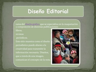 El documento discute diferentes tipos de diseño editorial que deben considerarse, incluyendo el público objetivo, la competencia, la legibilidad tipográfica y la conclusión de que los diseñadores editoriales están bien posicionados para diseñar sitios web exitosos.