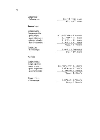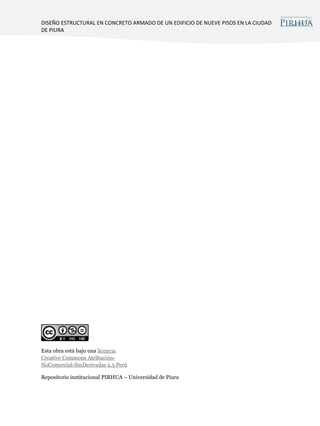 El documento presenta el diseño estructural en concreto armado de un edificio de nueve pisos en la ciudad de Piura. Inicialmente se realiza un estudio del suelo de cimentación para determinar el tipo de cimentación más adecuado, eligiéndose pilotes debido a las características del suelo. Luego se estructura y predimensionan los elementos estructurales principales del edificio. Posteriormente se realiza el análisis estructural bajo cargas sísmicas y gravitatorias para finalmente diseñar en detalle los
