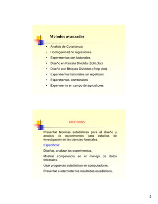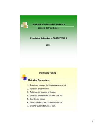 Este documento presenta un índice de temas sobre métodos estadísticos para el diseño y análisis de experimentos forestales. Incluye secciones sobre principios básicos de diseño experimental, tipos de experimentos, diseños específicos como bloques completos al azar y diseños factoriales, y objetivos de experimentación como diseñar, analizar y presentar resultados de experimentos forestales.