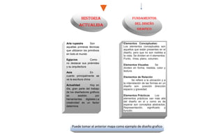El diseño gráfico se define como la acción de producir objetos visuales para transmitir un mensaje utilizando elementos como fotografías, ilustraciones, forma, color y textura. Existen diferentes tipos de diseño gráfico como el diseño para educación, diseño para persuasión y diseño para información. Los fundamentos del diseño gráfico incluyen elementos conceptuales, visuales, de relación y prácticos.