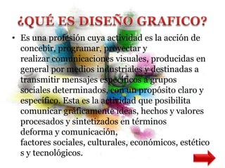 Este documento describe los diferentes elementos que componen el diseño gráfico, divididos en cuatro grupos: elementos conceptuales, elementos visuales, elementos de relación y elementos prácticos. Explica cada uno de estos elementos y proporciona ejemplos para ilustrar conceptos como forma, color, texto y significado. Además, menciona algunos productos de diseño como envases, folletos y carteleras.