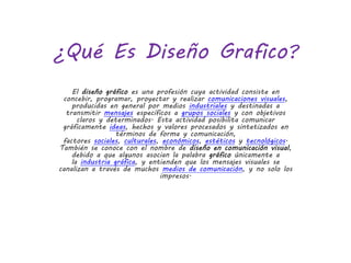El documento habla sobre diseño gráfico y el programa Flash MX. Explica que el diseño gráfico se refiere a la concepción y creación de comunicaciones visuales para transmitir mensajes específicos a grupos sociales. También describe a Flash MX como una herramienta para crear aplicaciones y contenido interactivo para la web, que incluye funciones de animación, sonido, gráficos vectoriales e interactividad.