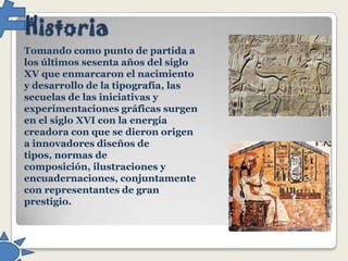 El documento describe el desarrollo del diseño gráfico desde el siglo XV hasta el siglo XVI, cuando surgen nuevos diseños e innovaciones como resultado de las iniciativas y experimentaciones gráficas del siglo anterior. Estas innovaciones incluyen nuevos diseños tipográficos, normas de composición, ilustraciones y encuadernaciones creadas por destacados representantes de la época.