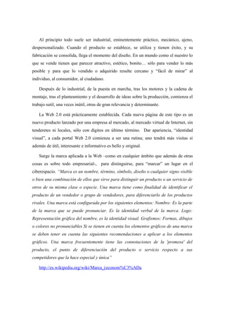 El documento discute la importancia del diseño gráfico y la identidad visual en el contexto de la Web 2.0. Explica que a medida que las páginas web se establecen como productos comerciales, es importante darles una apariencia atractiva y original para atraer visitantes y ventas. También destaca el papel creciente de marcas, logotipos e imágenes corporativas en distinguir sitios web y empresas en el espacio cibernético cada vez más saturado. Por último, señala que aunque el diseño web aficionado se ha v