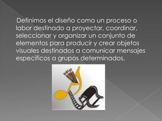 El diseño gráfico se define como un proceso destinado a crear objetos visuales para comunicar mensajes específicos. Se diferencia del arte en que busca ser aceptado por el consumidor. Las características de un diseñador incluyen ser observador, creativo, solucionador de problemas y tener originalidad. Los elementos del diseño son conceptuales, visuales, de relación y prácticos.