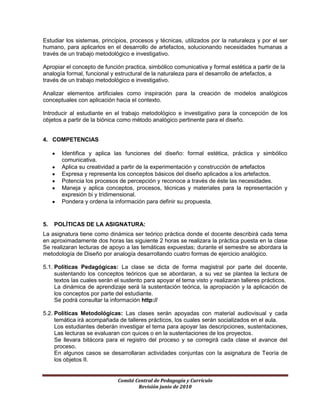 El documento presenta el plan de estudios para la asignatura de Diseño I en la Facultad de Arquitectura y Diseño de la Universidad Católica Popular del Risaralda. La asignatura se enfoca en enseñar a los estudiantes a analizar sistemas naturales y culturales para inspirar el diseño a través de la analogía. A lo largo de 15 semanas, los estudiantes aprenderán sobre biónica, morfología natural, funciones de insectos y analizarán una cultura para desarrollar diseños inspirados en est
