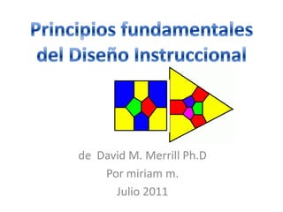 El documento describe los Cinco Principios Fundamentales del Diseño Instruccional propuestos por David M. Merrill: 1) Problema, donde los estudiantes resuelven problemas del mundo real; 2) Activación, activando conocimientos previos; 3) Demostración, demostrando lo que se aprenderá; 4) Aplicación, aplicando los nuevos conocimientos; y 5) Integración, integrando los conocimientos en su vida diaria.