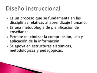 El diseño instruccional es un proceso metodológico para planificar la enseñanza que maximiza la comprensión y aplicación del aprendizaje, basándose en teorías y estructuras sistemáticas. Este modelo, que no siempre requiere la presencia del educador, se implementa en diversas fases y contextos, desde lo educativo hasta lo laboral, utilizando formatos tanto impresos como electrónicos. La integración de elementos interactivos y multimedia permite una experiencia de aprendizaje dinámica, adaptada a las necesidades del estudiante y facilitada por la educación en línea.