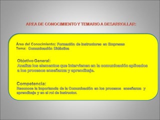 Este documento presenta el diseño de una sesión de capacitación sobre comunicación dirigida a instructores. La sesión consta de 10 actividades con el objetivo de que los participantes definan la comunicación y sus elementos, establezcan las diferencias entre comunicación básica y didáctica, identifiquen barreras en la comunicación básica y en el proceso comunicacional didáctico, y describan barreras en los diferentes elementos del proceso comunicacional didáctico.