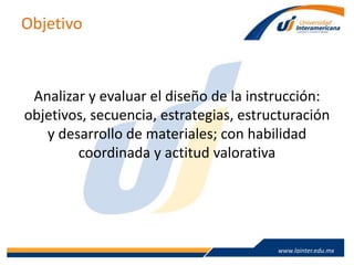 Este documento presenta la guía para la tercera semana de un curso de Diseño Instruccional. Analizará y evaluará el diseño de la instrucción, incluyendo objetivos, secuencia, estrategias y desarrollo de materiales. Los estudiantes aprenderán sobre objetivos instruccionales, diseño de secuencias y estrategias, y desarrollo de materiales. Como evidencia de aprendizaje, deberán elaborar una propuesta de diseño instruccional de al menos 8 páginas que incluya temas, objetivos, secuencia