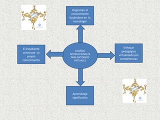 Este documento describe los fundamentos teóricos de los diseños instruccionales para entornos virtuales. Explica que estos diseños se basan en la tecnología para organizar el conocimiento y enfoques pedagógicos centrados en competencias, permitiendo que los estudiantes construyan su propio conocimiento a través del aprendizaje significativo. Además, destaca que los diseños instruccionales para entornos virtuales son flexibles, moldeables, accesibles y adaptables, e incluyen componentes como objetivos, secuencia, evaluación y e