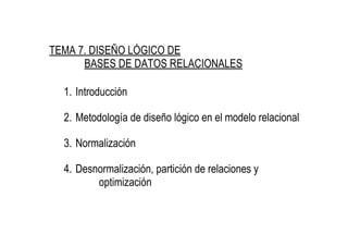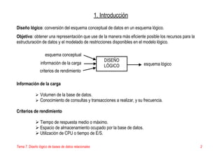 Este documento describe la metodología para el diseño lógico de bases de datos relacionales. Explica cómo convertir un esquema conceptual en un esquema lógico mediante la transformación de entidades en tablas y relaciones en claves ajenas y tablas. También cubre la normalización, definición de restricciones y validación del diseño lógico con los usuarios.