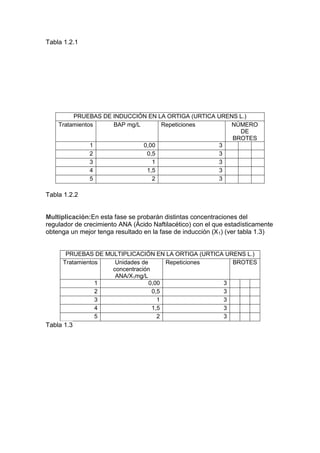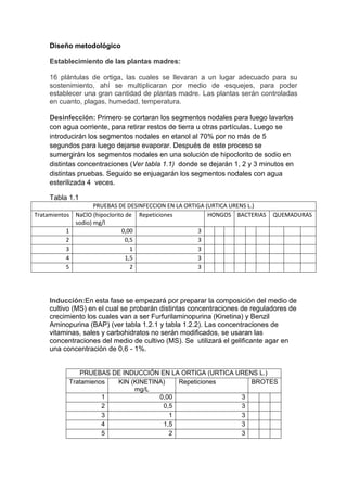El documento describe el diseño metodológico para la propagación de ortiga mediante esquejes. Se establecerán 16 plantas madres que se multiplicarán por esquejes para obtener un gran número de plantas. Luego, los segmentos nodales serán desinfectados mediante lavado, etanol y soluciones de hipoclorito de sodio. Finalmente, se inducirán brotes en los esquejes utilizando diferentes concentraciones de reguladores de crecimiento como la kinetina y BAP en medios de cultivo, y se probarán concentraciones de ácido