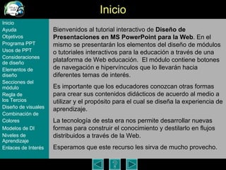 El documento presenta un tutorial interactivo diseñado en PowerPoint para enseñar sobre el diseño de módulos interactivos para la web. Explica elementos de diseño como el tamaño de texto, uso de gráficos e imágenes, colores, y estructura de navegación. También discute consideraciones de diseño como establecer objetivos claros y contenido apropiado para promover la comprensión.