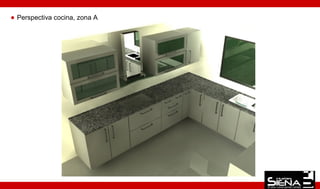 El documento presenta los planos y perspectivas de una cocina dividida en 3 zonas. Se muestran las vistas de la Zona A, B y C, incluyendo muebles y detalles de cada área.