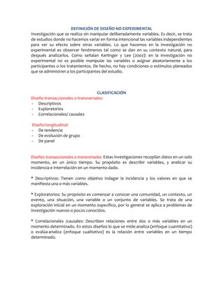 Este documento presenta una definición y clasificación de los diseños no experimentales. Define el diseño no experimental como la investigación que observa fenómenos tal como ocurren naturalmente sin manipular deliberadamente las variables. Clasifica los diseños en transaccionales (descriptivos, exploratorios, correlacionales), longitudinales (de tendencia, evolución de grupo, panel) y retrospectivos y prospectivos.