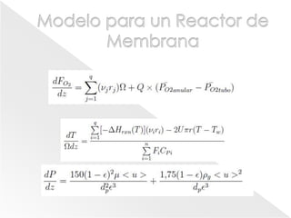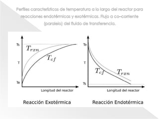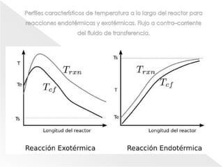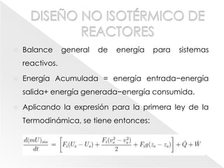 El documento describe los principios de la termodinámica y la cinética de reacciones químicas que ocurren en reactores. Explica que la energía acumulada en un sistema reactivo es igual a la energía de entrada menos la salida más la generada menos la consumida. También cubre temas como operaciones adiabáticas vs no adiabáticas, reacciones en equilibrio, cinética química y diseño de reactores CSTR y PFTR.