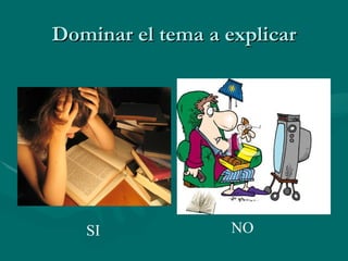 Para ser un buen orador, es importante dominar el tema a explicar, tener claro el objetivo de la presentación y conocer el nivel de conocimiento de la audiencia. La estructura de una buena presentación debe incluir una introducción, un desarrollo con la información principal y una conclusión. Las diapositivas deben tener un título claro, texto breve y conciso, y utilizar imágenes, videos y sonidos que acompañen pero no distraigan a la audiencia.