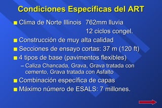 El documento presenta los conceptos clave para el diseño de pavimentos flexibles según el método AASHTO, incluyendo variables de diseño como tráfico, periodo de análisis, nivel de confianza y efectos ambientales. Explica el cálculo del número estructural y los procedimientos para determinar los espesores requeridos de las capas, considerando factores como módulos resilientes y coeficientes estructurales. También cubre temas como construcción en etapas, análisis de sensibilidad y limitaciones del método.