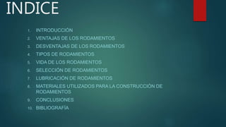 Este documento trata sobre el diseño y selección de rodamientos. Explica las ventajas y desventajas de los rodamientos, los diferentes tipos de rodamientos como rígidos de bolas, de bolas a rotula y cilíndricos. También cubre temas como la vida útil de los rodamientos, su selección, lubricación y materiales utilizados en su construcción. Finaliza con conclusiones y una bibliografía.