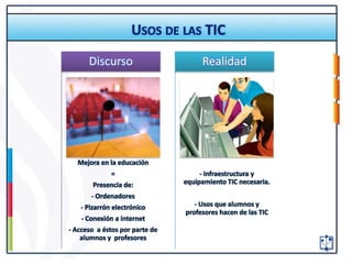 Este documento discute el diseño tecnopedagógico y los usos educativos de las tecnologías de la información y la comunicación (TIC) en la enseñanza. Explica que el diseño tecnopedagógico, que considera tanto los aspectos tecnológicos como pedagógicos, condiciona los usos que profesores y alumnos hacen de las herramientas TIC. También señala que no todos los usos de las TIC favorecen por igual el aprendizaje y que es necesario identificar los factores que
