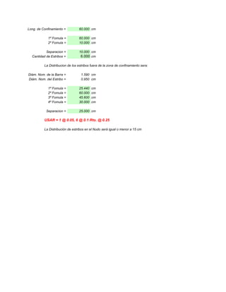 El documento describe la distribución de estribos en vigas y columnas. Se especifica que la zona de confinamiento en una viga será igual a 2 veces su peralte y que la distribución de estribos dentro de esta zona seguirá ciertas fórmulas. Fuera de la zona de confinamiento, la separación máxima de estribos será de 35 cm o 1/4 del ancho de la viga. Similarmente, se detalla la distribución de estribos dentro y fuera de la zona de confinamiento para una columna.