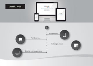 Este documento presenta los servicios de diseño web de una empresa, incluyendo el desarrollo de aplicaciones móviles, catálogos virtuales, tiendas en línea y sitios web corporativos. Describe las características clave de cada servicio como diseño responsivo, optimización SEO, pasarelas de pago integradas y soporte técnico gratuito. El objetivo es ayudar a las empresas a aumentar sus ventas, llegar a nuevos clientes y promover sus productos y servicios a través de soluciones de diseño y marketing digital.