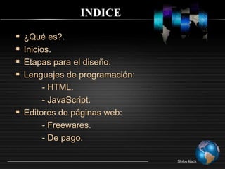 El diseño web involucra la planificación, diseño y creación de páginas web considerando la navegabilidad, interactividad y contenido multimedia. Los lenguajes HTML y JavaScript son fundamentales, mientras que editores como Dreamweaver y NVU facilitan el proceso. El diseño web ha evolucionado desde solo texto a incluir video e interactividad, con un crecimiento exponencial de páginas desde las 50 iniciales a las 8 mil millones actuales.