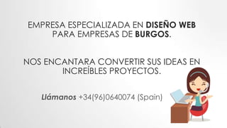 Este documento ofrece servicios de diseño web y presencia en internet para empresas en Burgos, España. Proporciona diseño de páginas web, tiendas virtuales, marketing online, redes sociales, hosting y dominios. Explica que diseñan sitios web fáciles de gestionar con contenido y que atienden clientes de toda España desde sus oficinas en el Reino Unido y Valencia.