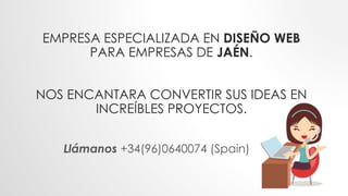 Este documento ofrece servicios de diseño web para empresas en Jaén, España. Proporciona diseño de páginas web, tiendas virtuales, marketing online, redes sociales, hosting y dominios. Explica que diseñan sitios web fáciles de gestionar con gestores de contenido para que los clientes puedan realizar publicaciones y modificaciones cuando lo deseen. También menciona que la empresa está ubicada en Inglaterra pero cuenta con una oficina en Valencia, España para ofrecer diseño web a empresas españolas.