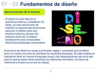 El documento presenta los fundamentos básicos del diseño, incluyendo elementos conceptuales (punto, línea, plano, volumen), elementos visuales (forma, medida, color, textura), elementos de relación (dirección, posición, espacio, gravedad) y elementos prácticos (representación, significado, función). Explica que el diseño trata del proceso creativo para satisfacer necesidades mediante el uso de principios, reglas y conceptos visuales.