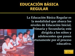 El documento describe la organización y objetivos de la Educación Básica Regular en Perú. Explica que consta de tres niveles - Educación Inicial, Primaria y Secundaria - con logros de aprendizaje progresivos. Detalla las áreas curriculares, fines y características deseadas en los estudiantes al concluir cada nivel. Resalta que el diseño curricular nacional busca formar de manera integral a los educandos y dar unidad al sistema educativo peruano.