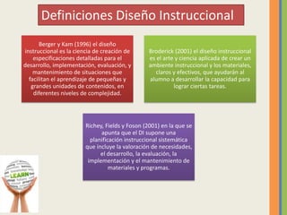 El documento presenta una revisión de los principales modelos de diseño instruccional a través de las décadas, comenzando con el conductismo en los 60, la teoría de sistemas en los 70, el cognitivismo en los 80, el constructivismo en los 90 y el conectivismo en el siglo XXI. También describe los modelos de Gagné, Briggs, Heinich y ADDIE, resaltando los aspectos teóricos en los que se fundamentan.